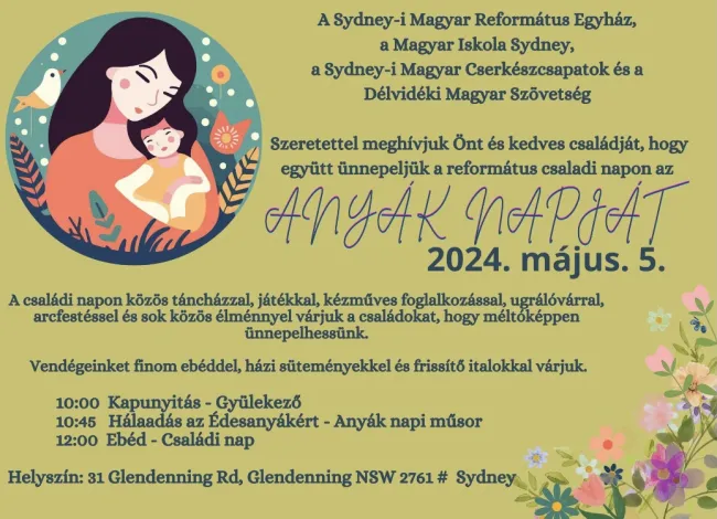 Az első rendezvény az anyák napja volt, amit a Sydney-i Magyar Református Egyház, a Magyar Iskola Sydney, a Sydney-i Magyar Cserkészcsapatok és a Délvidéki Magyar Szövetség közös szervezésében tartottak meg. A református családi napként is elnevezett programon közös hálaadással, egy kedves kis anyák napi műsorral és finom ebéddel köszöntötték fel a magyar édesanyákat a Délvidéki Magyar Szövetség nagytermében. A nap hátralevő részében közös táncház, kézműves foglalkozás, ugrálóvár, arcfestés és sok-sok játék várta az ünneplő családokat, estére pedig mindenki elmondhatta, hogy az örömkönnyektől kezdve, a finom falatokon át, a megannyi közös élményig minden belefért ebbe a méltóképpen megünnepelt napba.