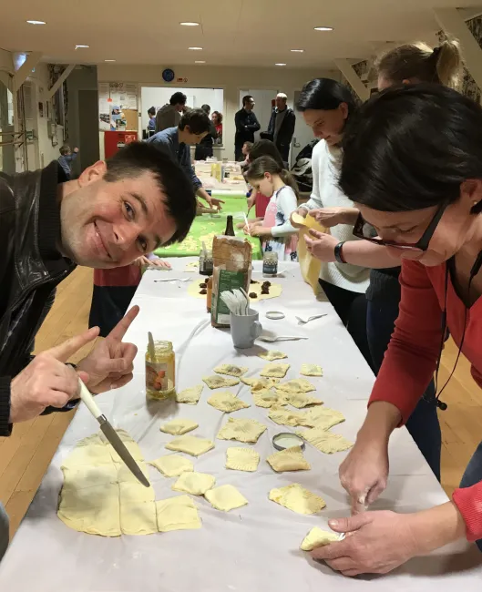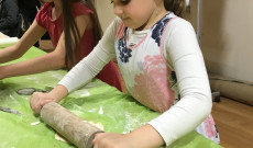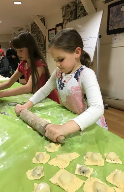 Mikor készen lettek a pihentetés után a tészták, a szülők kinyújtották, a kicsik pedig kiszaggatták és szilvalekvárral, baracklekvárral, aszaltszilvával elkezdték megtölteni a derelyéket. Eközben kiderült, hogy nem maradt elég liszt a nyújtáshoz, így gyorsan egy apuka magára vállalta, hogy elszalad a boltba. Amíg vártuk az utánpótlást a gyerekek fogócskáztak és szülők nagy örömére magyarul beszélgettek.