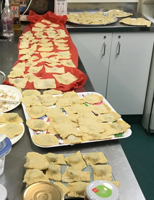 Mindenki asztalhoz ült és közös vacsora keretében elfogyasztottuk munkánk gyümölcsét. Minden derelyének meg volt a maga különleges alakzata. Sok kéz által sok forma született és művészi alkotássá vált az egész asztal.