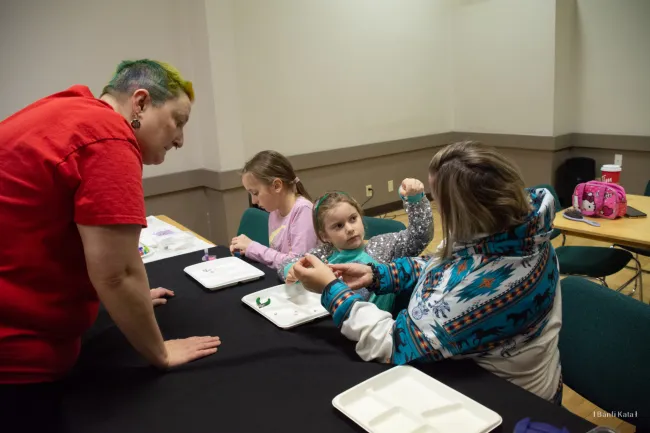 Kétféle „csomagból” lehetett választani. A délután folyamán a résztvevők vagy egy háromsoros népi kalárist készíthettek el a hozzá passzoló fülbevalóval, vagy két pár egyénileg összeállított fülbevalót alkothattak. Emellett folyamatosan működött a hajfonó sarok is, ahol az anyukák a néptánchoz illő, színpadra is megfelelő hajviseleteket sajátíthatták el.