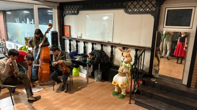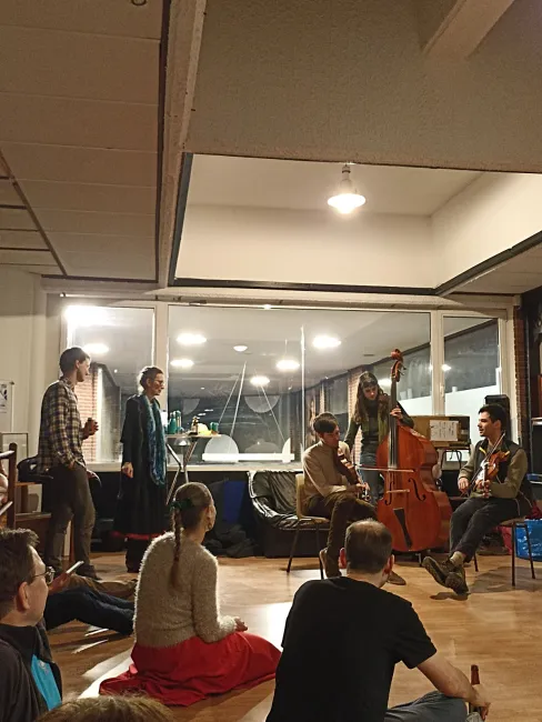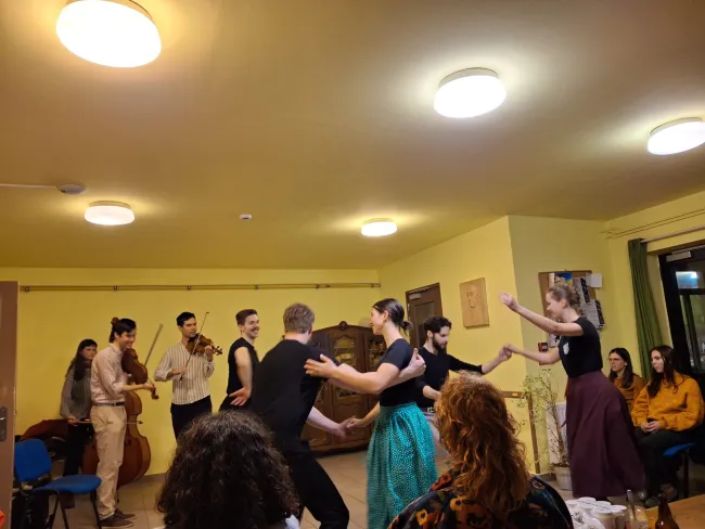 Februárban a Viola Táncegyesület egyik szokásos szerdai próbája különleges hangulatban telt: a Hegymegett nevű zenekar biztosította az élő zenét. Az együttes három testvérből áll, akik közül az egyik az elmúlt fél évben a Leuveni Egyetemen vett részt csereprogramon, így került kapcsolatba a Viola Néptáncegyesülettel.