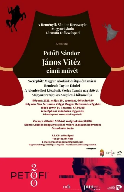 Zsúfolásig megtelt a San Fernando Völgyi Magyar Református Egyház rendezvényterme, ahol a Reményik Sándor Keresztyén Magyar Iskola színjátszói, a Lármafa Diákszínpad mutatta be Petőfi Sándor egyik leghíresebb költeményét. A színdarab plakátja János vitéz Huszárok János vitéz és az óriás