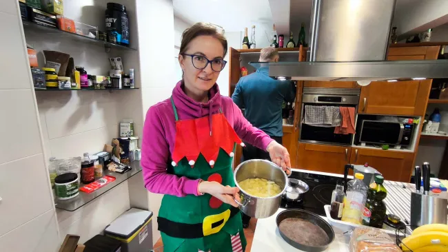 Az étel nagyon egyszerű: krumpli és liszt kell hozzá. A spanyol és kolumbiai családtagok érdeklődve figyelték az elkészítését, és amikor elmondtam, hogy az eredeti recept szerint sertészsírban sült hagymába kellene forgatni a krumplidarabkákat, teljesen hátrahőköltek. Aztán megnyugodtak, amikor meglátták az asztalon az olívaolajat. Nagyot nevettem, és mondtam nekik: