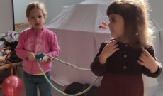 Ezután egy ügyességi játék következett, ahol párokban, lufikkal összeszorítva kellett eljutniuk egyik faltól a másikig. A feladat során sokat nevettünk, különösen amikor az egyik kisgyermek, aki egy kicsit félénk volt, csak az anyukája segítségével vállalta el a kihívást.