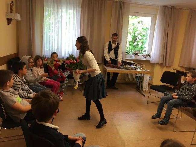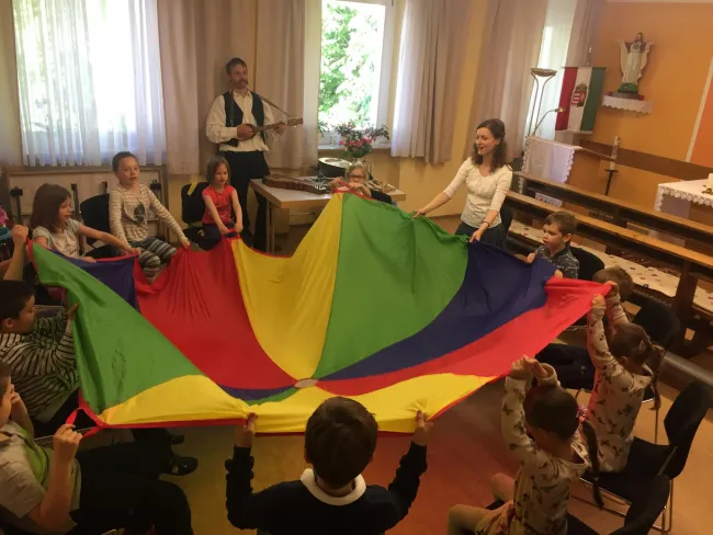 A foglalkozáson ölbeli játékokat, népi énekeket, mondókákat tanulhattunk tőle, az általam megszólaltatott népi hangszerek kíséretével. Sikerült a magyar iskola pedagógusait is kíváncsivá tenni, így a legkisebb tanulóknak közösen tarthattunk órát. Számomra nagyon izgalmas volt figyelni, ahogy eleinte kissé mereven fogadták Katát, s a drámapedagógia által, a Kerekítő Manóval hogyan oldódtak fel a gyermekek szinte varázsütésre. Ez a mókás bábfigura egy pillanat alatt elérte a kis tanulók aktív részvételét. Csak úgy szárnyalt a fantáziájuk, s Kata ügyesen alakította hozzá a cselekményt. Hová utazzunk? Mit vigyünk magunkkal a kirándulásra? A gyerekek lelkesen énekeltek, ritmust tapsoltak, írták Mátyás király levelét egymás hátára… A katarzist azonban a szivárványszínű ejtőernyő jelentette, ami egyik pillanatban láthatatlanná varázsolta, majd újra elővarázsolta őket. Végezetül előkerültek a labdák, amit nagy élvezettel ugrasztottak ki az ejtőernyőből. A foglalkozás alatt a gyerekekkel egy dalt is megtanultunk az édesanyák köszöntésére. Megismertük Kata vonatfüttyét, harkályát, az odúsípját, csettegőjét, rece-ficéjét, és általam megszólalt a tilinkó, citera, tambura, meg a koboz. Mondhatom igazán jól szórakoztunk mindnyájan, de számunkra még nem ért véget a munka.