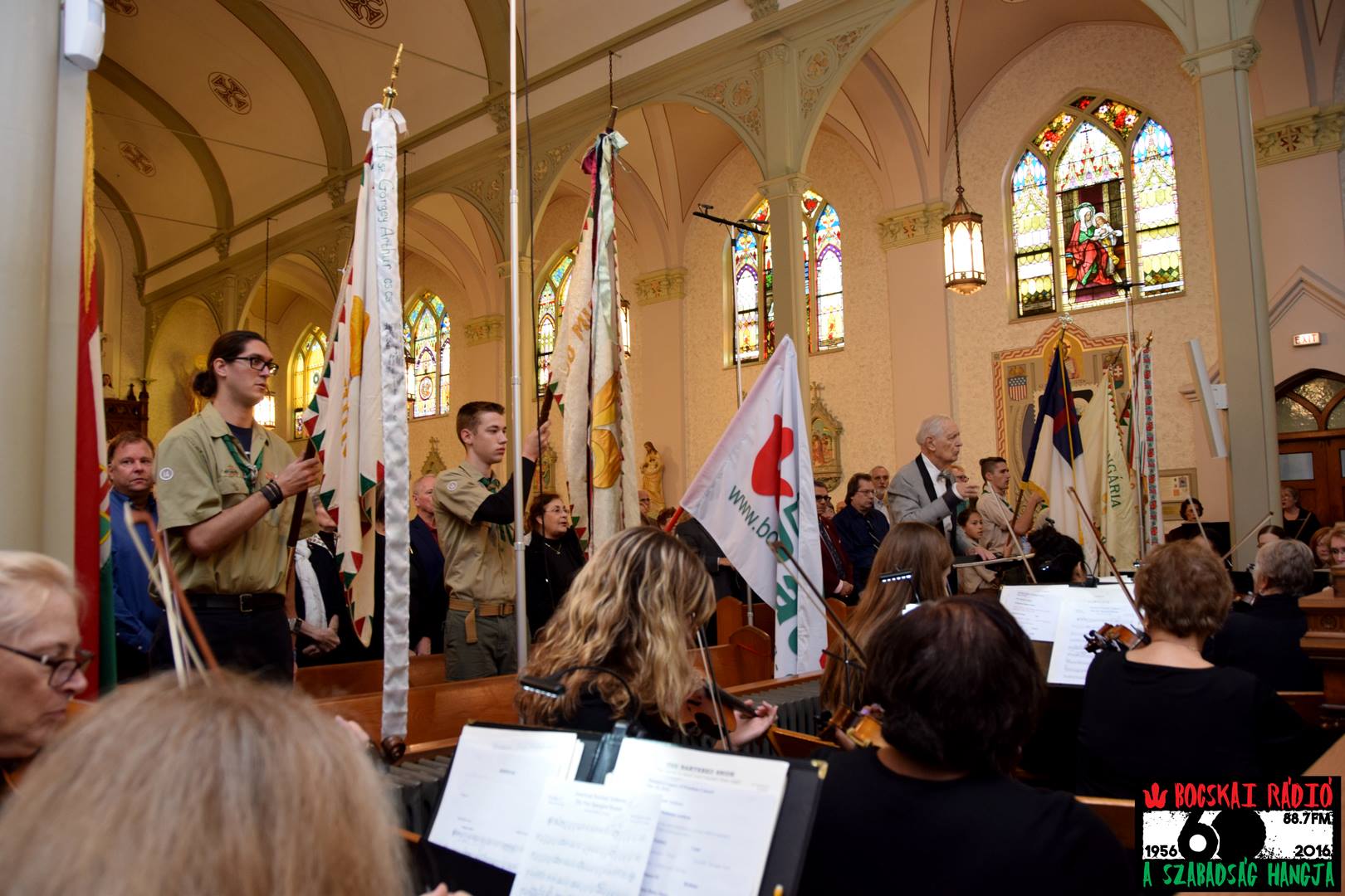 A köszöntő szavakat követően a cserkészek az Egyesült Magyar Egyletek tagszervezeteinek a zászlóit vonultatták be ünnepélyes keretek között. Majd ezt követően az amerikai, majd a magyar himnuszt énekelte együtt a közönség a zenészek csodás játékának kíséretében.