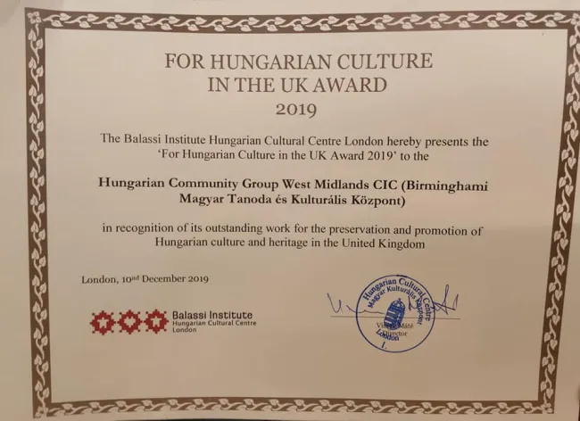 Nagy elismerésben részesült a Birminghami Magyar Tanoda és Kulturális Központ: 2019-ben elnyerte a Magyar Kultúráért az Egyesült Királyságban Díjat. Címkefelhő magyar kultúráért díj Birmingham