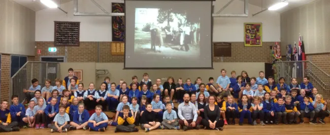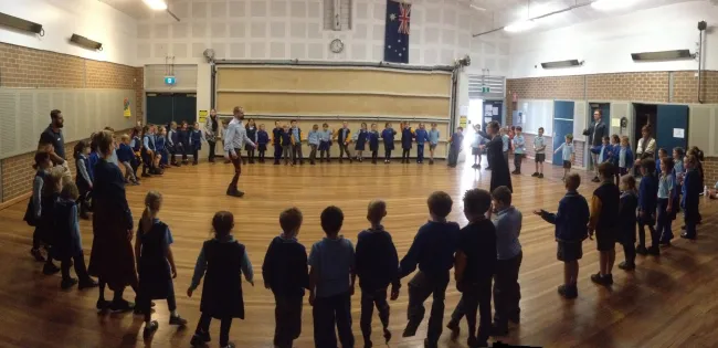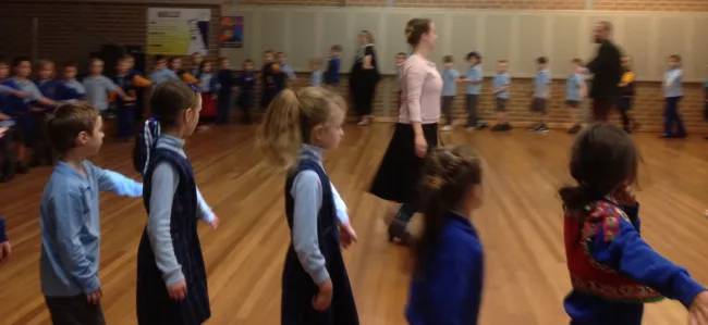 A tanulók négy turnusban érkeztek az iskola dísztermébe, ahol a táncház zajlott. Mindegyik turnusban 3 osztályt tanítottunk, így a nap végére 12 osztályt oktattunk. Az első turnus már a teremben ült, amikor megérkeztünk. Megdöbbenve láttam, hogy a csillogó szempárok igencsak fiatalka arcocskákról kacsintgatnak. Itt Sydney-ben az iskolákat ugyanis 4 és fél, 5 éves korban kezdik a gyerekek és az első osztályt „iskola előkészítő”-nek nevezik, ez amolyan nulladik évfolyamnak felel meg. Tehát a legapróbbak vártak minket, akiknek az izgatott csiripelésétől az iskolaudvar már percek óta zengett.