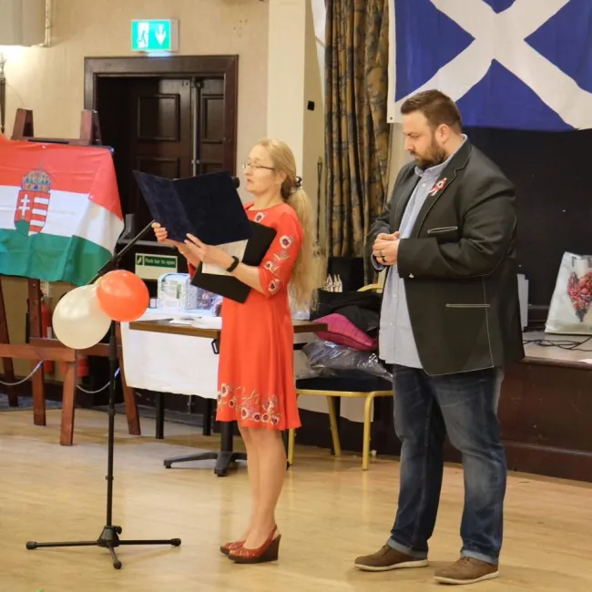Az eseményen természetesen részt vettek fontos vendégek is, akik üdvözlő szavakkal, jókívánságokkal és fontos információkkal szolgáltak a helyi magyaroknak. Deputy Lord Provost, Perth Councillor Willie Wilson és Norman Irons edinburgh-i tiszteletbeli konzul baráti köszöntő szavai után a Brüsszelből érkezett Szalay Tamás Lajos Európa Parlamenti képviselő beszéde következett, aki szintén tolmácsolta Dr. Ujhelyi István Európai Parlamenti képviselő és a skót Fiona Hyslop, a Kulturális-, Turisztikai- és Külügyminiszter elismerő szavait, akik levélben köszöntötték az egybegyűlteket. Mindezek után Senga Munro, (MBE) a Skót Mesemondó Szövetség tiszteletbeli elnöke magyar népmesével szolgált közönségnek (ahogy minden évben 2001-től).