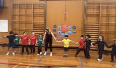 Két csoportnak tartottam órát. Először a kisebbek jöttek, akik igazi energiabombaként robbantak be a terembe. Az első pár perc még a figyelem összeszedéséről szólt, de amint megszólalt a zene, és elkezdtük a lépéseket, mindenki izgatottan kapcsolódott be. Sokszor ismételtünk, de nagyon élvezték, különösen azt a részt, amikor a kör közepébe kellett szaladni. Itt persze már ritmust nem ismerve rohantak előre, de az öröm és nevetés mindent felülírt. A végén mosolyogva, kipirulva mentek vissza az osztályterembe.