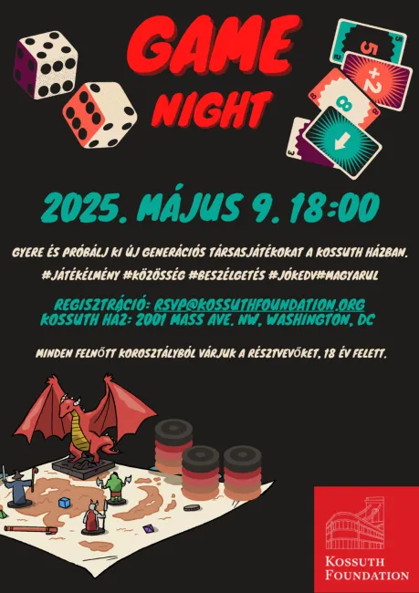 2024 decemberétől a washingtoni Kossuth Alapítvány új programsorozatot indít: magyar társasjáték estekkel várják az érdeklődőket Amerika fővárosában. Az eseményeket jómagam szervezem azzal a céllal, hogy a magyar diaszpóra közössége újgenerációs társasjátékok révén találkozhasson, kapcsolódhasson.