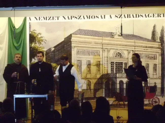 Az előadás két részből állt. A beszédekből, köszönetnyilvánításokból és a Csöbörcsök Táncegyüttes, valamint a Stuttgarti Magyar Színikör közös műsorából. A színikör tolmácsolásában láthattuk a haza feladására kényszerült, csalódott ember tragédiájával, majd hitének örömteli visszanyerésével, valamint megismerhettük az első magyar színház létrejöttének tréfás, de egyben megható történetével. A Csöbörcsök Táncegyüttes bukovinai és palatkai táncokat mutatott be. Lendületes, dinamikus, találékony, mégis végtelenül érzékeny előadásukkal méltóképpen emlékeztek meg a szabadság e rendkívüli napjáról. Az estet a mindenki által ismert „Kossuth Lajos azt izente…” című nóta, valamint a székely és nemzeti himnusz zárta.