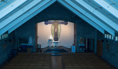 A kb. 7,5-szer 5 méteres műalkotás a templom keleti oldalán, az oltár fölött és mögött látható, amelyen Krisztus diadalmasan látható a Kereszten, egy ragyogó arany háttér előtt.