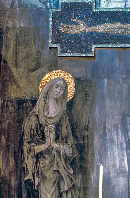 George Mayer-Márton 1955-ös alkotása, a Keresztre feszítés, a bizánci módszert használja, amely mozaikot és freskót kombinál. Ez az első és egyetlen megmaradt, ilyen technikával készült mű az Egyesült Királyság területén!