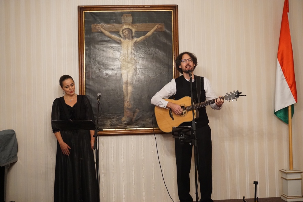 Éppen ezekkel a lelki kapaszkodókkal áll gyönyörű összhangban a Fénnyel telt téli sötét című verses-énekes műsor – hangzott el az est elején, és felidéztük azt is, hogyan fogalmazták meg az előadás megszületésének és tartalmának lényegét maguk a művészek: „Valamifajta megkerülhetetlen készület, felfokozottság sokszínű elegye a karácsonyt megelőző néhány hét. Az utcákon és a kertekben dísz-fénysorok. A napok múlásával növekvő tömeg mindenütt, s miközben teljesítjük bevásárlásainkat, egyre nagyobb pompával hív minket a világ. Közben örülünk az első hónak, a jól kitalált ajándékoknak, a mézeskalács- és süteményillatnak s az ünnep által ígért találkozásoknak. Minden azt sugallja, hogy közeledik valami. S amikor az ünnep megérkezik, mintha sokszor mégsem történne meg, amire vártunk. Talán túl nagy volt a hangzavar és túl sok volt a fény… Pedig a karácsonyt megelőző várakozás a világ világossága csendes eljövetelében éri el jutalmát.” Éppen ehhez: az ünnephez való megérkezéshez, az elcsendesedéshez segített hozzá a két népének mellett Petőfi Sándor, Radnóti Miklós, Juhász Gyula, József Attila, Szilágyi Domokos, Dsida Jenő, Babits Mihály, Reményik Sándor, Ady Endre, Pilinszky János, Thándor Márk, Weöres Sándor, Szabó Lőrinc, Nemes Nagy Ágnes, Szepesi Attila, Gyöngyössi János és Kovács András Ferenc művei, műrészleteiből összeállított előadás, a költészet, a gitárral kísért ének és az előadóművészet csodálatos együttese, amely, ahogy kívántuk, igazán magasra emelte a lelkünket.
