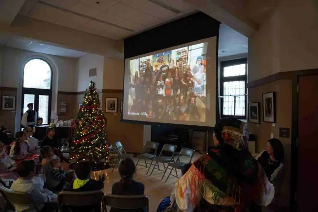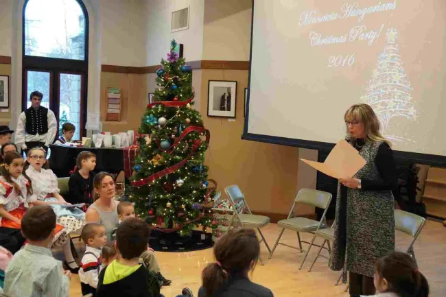 Mialatt vártuk a Mikulást, Grauzer Csilla – a Minnesotai Magyarok elnöke – ünnepi gondolatokkal köszöntötte a megjelenteket. Beszédét követően levetítették azt a kisfilmet, amit a Birminghami Magyar Tanoda készített a magyar iskolákról, amelyek csatlakoztak az általa szervezett, kontinenseken átívelő, karácsonyi ajándékozó játékhoz. Megható volt látni, a világ hány különböző szegletében, hány magyar gyerek dolgozott ugyanolyan lelkesen, számára ismeretlen társai ajándékán, mint a mi minnesotai diákjaink. A MISI Magyar Iskola részére címzett csomagot a DIÓ – Dublini Iskola és Óvoda – diákjai állították össze. A kedves, kézzel készített képeslapok jól látható helyen lettek kiállítva, hogy bárki megcsodálhassa őket, így értékes díszeivé válva az estének.