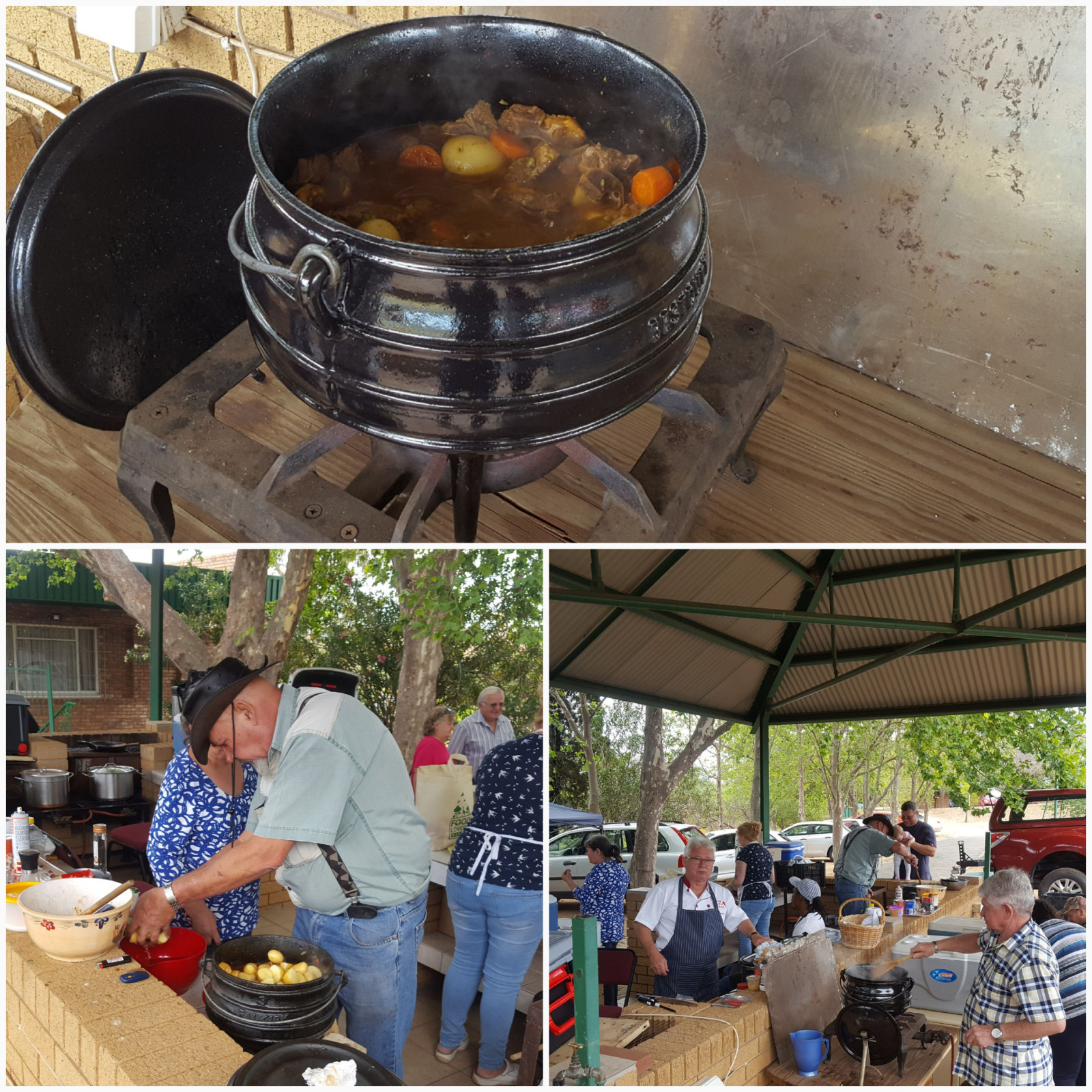A versenyzők közül többen tapasztalt szakácsok, akik otthon rendszeresen főznek, de akadt olyan is, aki életében először főzött és csak a társaság miatt jelentkezett. Természetesen nem csak azokat vártuk, akik főzni is szerettek volna, hanem azokat is, akik kíváncsiak a magyar vagy éppen helyi ízekre és a meccs megtekintése után enni szerettek volna egy jó egytálételt. Választékban nem volt hiány: az érdeklődők többféle étel közül választhattak: marha vadas, csirkepörkölt nokedlivel, csülkös bableves, lecsó, pacal vagy éppen nyúlpaprikás képviselte a magyar konyhát, míg a bárány curry és az oxtail (ökörfarok) a nemzetközi ízek szerelmeseinek kedvezett. A versenyzők reggel 10 óra óta főzhettek a tanya udvarán, ki potjiekosban (ez egy tipikus helyi öntöttvas edény, picit hasonlít a bográcshoz), ki bográcsban. Én reggel 9 órától kint voltam, igen ínycsiklandozó illatok terjengtek már reggel óta. Az édesszájúak sem maradtak hoppon, hisz ketten is adományoztak desszertet eladásra, így 3-féle rétessel, lekváros gombóccal vagy éppen császármorzsával lehetett befejezni az étkezést. Sokan voltak, akik nem bírtak ellenállni a kísértésnek és majdnem mindent végigkóstoltak.