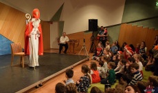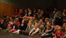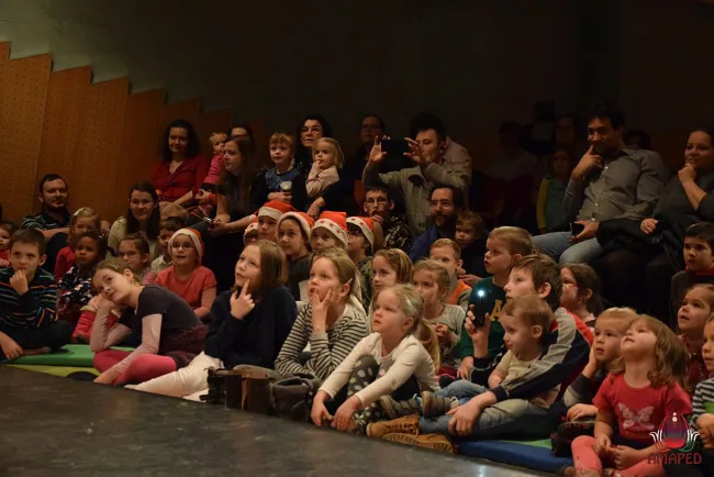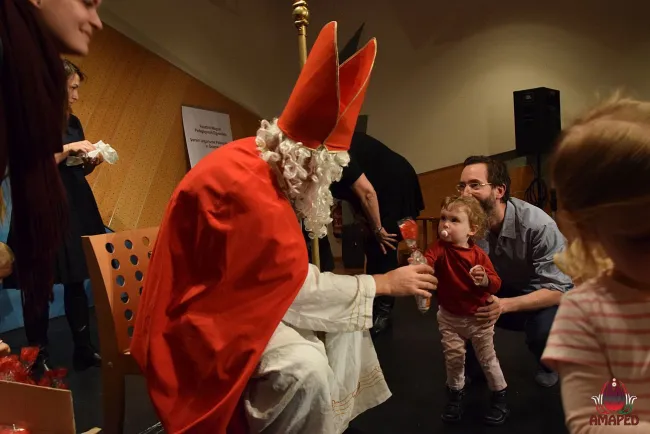 Mikulás napján közel kétszáz lelkes gyerek és szülő érkezett a Collegium Hungaricum nagy termébe, hogy együtt várják a Mikulást. Az egybegyűlteket Mentsik Szilvia, az AMAPED elnöke köszöntötte, ezt követően pedig a Mesebolt Bábszínház előadását élvezhették a résztvevők. A Vásártér című háromrészes bábjáték felelevenítette a hajdanvolt vásárok hangulatát, amikor még mutatványosok, csepűrágók, bábosok járták a vásártereket. A fából faragott figurák egy hagyományos szoknyás bábszínpad ráncai közül bukkannak elő, melyet mindig hangos gyermekkacaj kísért. Az előadást gyermektáncház követte, ahol a kicsik kedvükre ugrálhattak, táncolhattak.