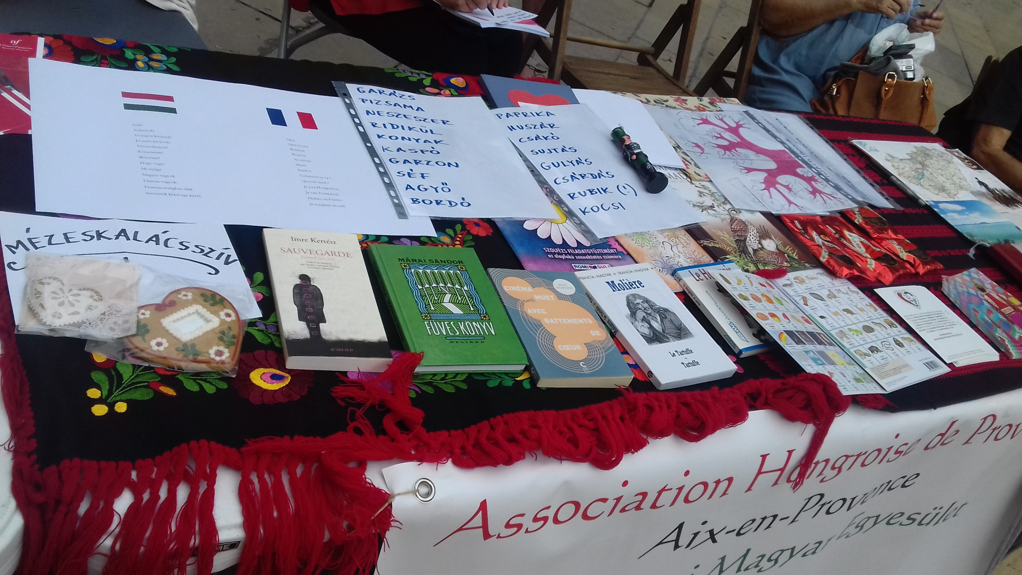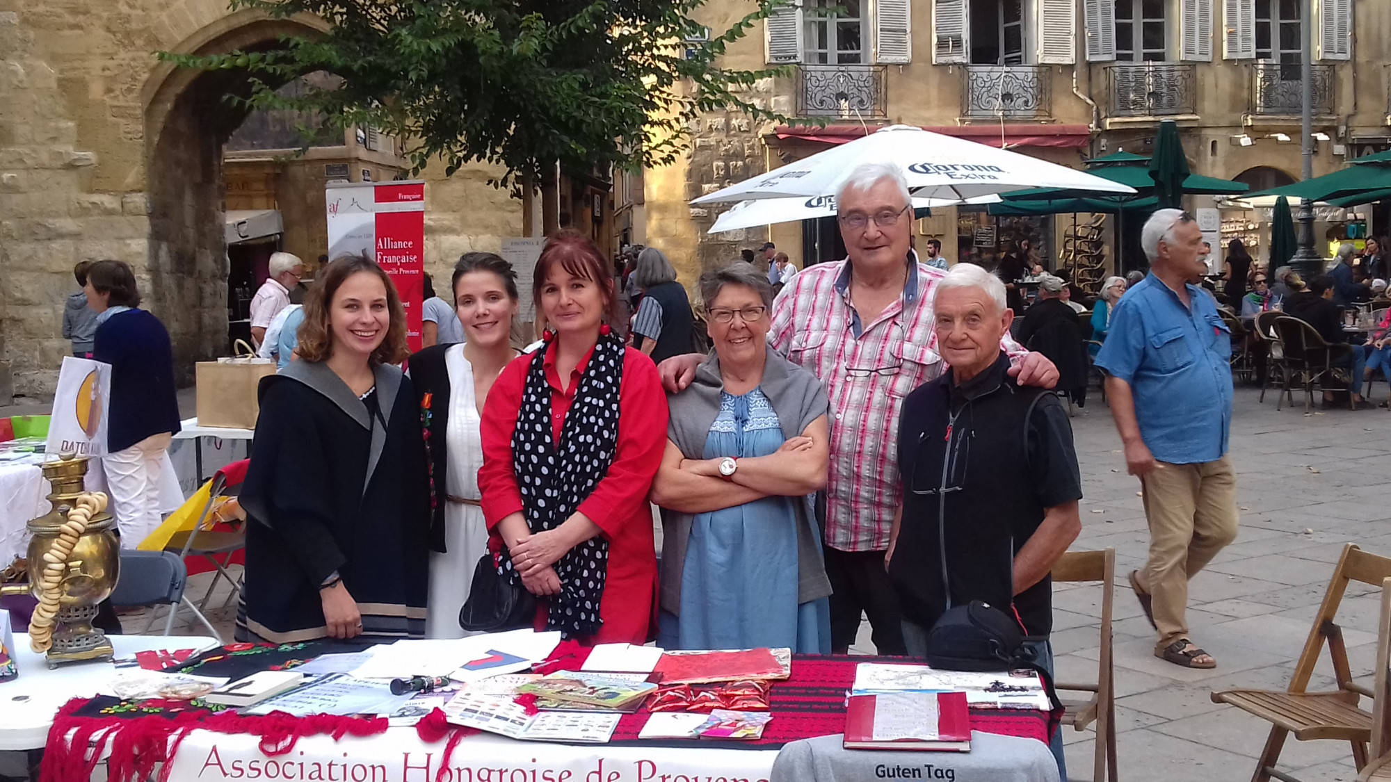 Szeptember 26-án Aix-en-Provence óvárosában, a városháza előtti téren gyűltek össze a különböző nyelvi kisebbségeket reprezentáló szervezetek, hogy bemutatkozhassanak a városi vezetés által immár sokadik éve megrendezett találkozón. A magyar egyesületen kívül képviseltette magát a helyi lengyel, német, spanyol, olasz és orosz közösség, de jelen volt a francia nyelv népszerűsítését célzó, a városban élő nagyszámú külföldi diák érdeklődésére méltán igényt tartó Alliance Française is. A szervezetek saját standjuknál szerveztek különféle játékos nyelvi animációkat, majd egyesével rövid zenés bemutatkozót is tartottak. Az Aix-en-Provence-i Magyar Egyesület képviseletében nagy sikernek örvendő, válogatott népzenei ízelítőt nyújtottunk. Nehéz szavakba önteni, mennyire megható, felemelő és méltóságteljes érzés volt magyarul énekelnünk egy, az otthonunktól ilyen távol eső francia város főterén! Hasonló nemzeti büszkeség tükröződött minden, kultúrája (nép)zenei kincseibe bepillantást nyújtó egyesület fellépésén is. Egyszerre kellemes, szórakoztató és magasztos programnak voltunk szervezői és résztvevői, amelyen megtiszteltetés volt hazánkat képviselni.
