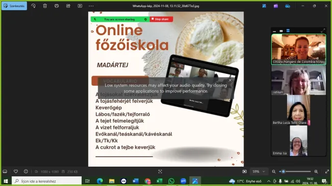 A Kolumbiai Magyar Körben a magyar nyelv oktatása online formában zajlott a Kör zoom-felületén keresztül. Az utolsó órán minden csoporttal közösen sütöttünk, főztünk - természetesen ezt is online.