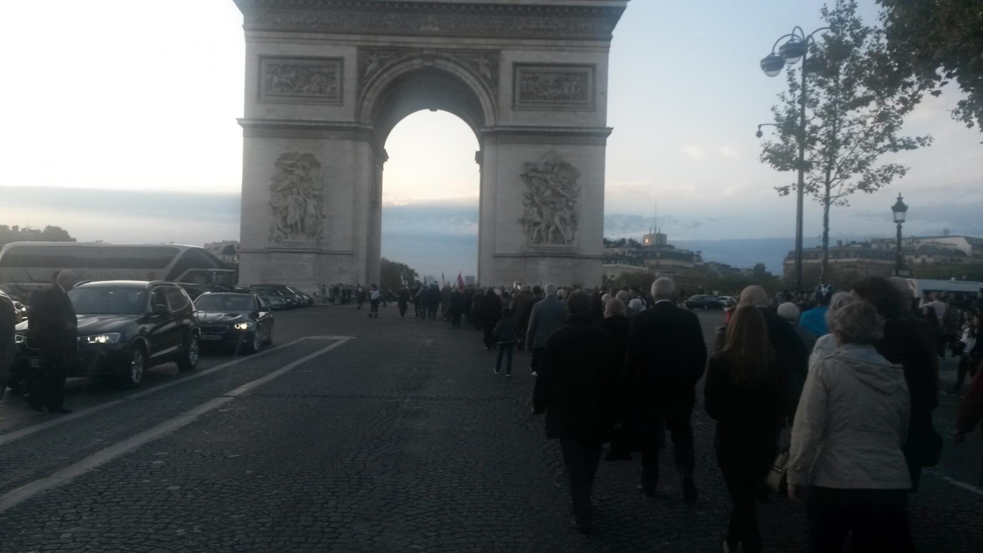 Az ünnepség kezdetén zászlókkal és koszorúkkal vonultunk a Champs-Élysées felső szakaszán a Diadalívig, ahol egy katonazenekar előadásában felcsendült a francia, majd a magyar himnusz. A felsorakozó francia huszárok tiszteletadása után Sujánszky Jenő, az emlékbizottság elnöke, Károlyi György nagykövet úr, valamint a francia Charles de Gaulle Emlékbizottság képviselői meggyújtották az öröklángot a hősi halált halt mártírok tiszteletére, és az ismeretlen katona sírjánál elhelyezték az emlékezés koszorúit. A hagyományoknak megfelelően az emlékbizottság tagjai az egybegyűltekkel is kezet fogtak. A több száz fős tömegben jobbára az idősebb korosztály képviseltette magát, köztük sokan olyanok, akik maguk is átélték a forradalmat, majd menekültek Franciaországba a forradalom után.