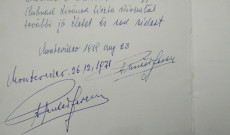 “A Real Madrid footbal csapatával Montevideóba voltunk. Ez alkalommal részt vettünk a Szent István ünnepélyen. Sok sikert kívánunk a Magyar Egyesületnek.” Keltezés: “Montevideo, 1958 aug. 24. Aláírás: sajnos számomra kiolvashatatlan.