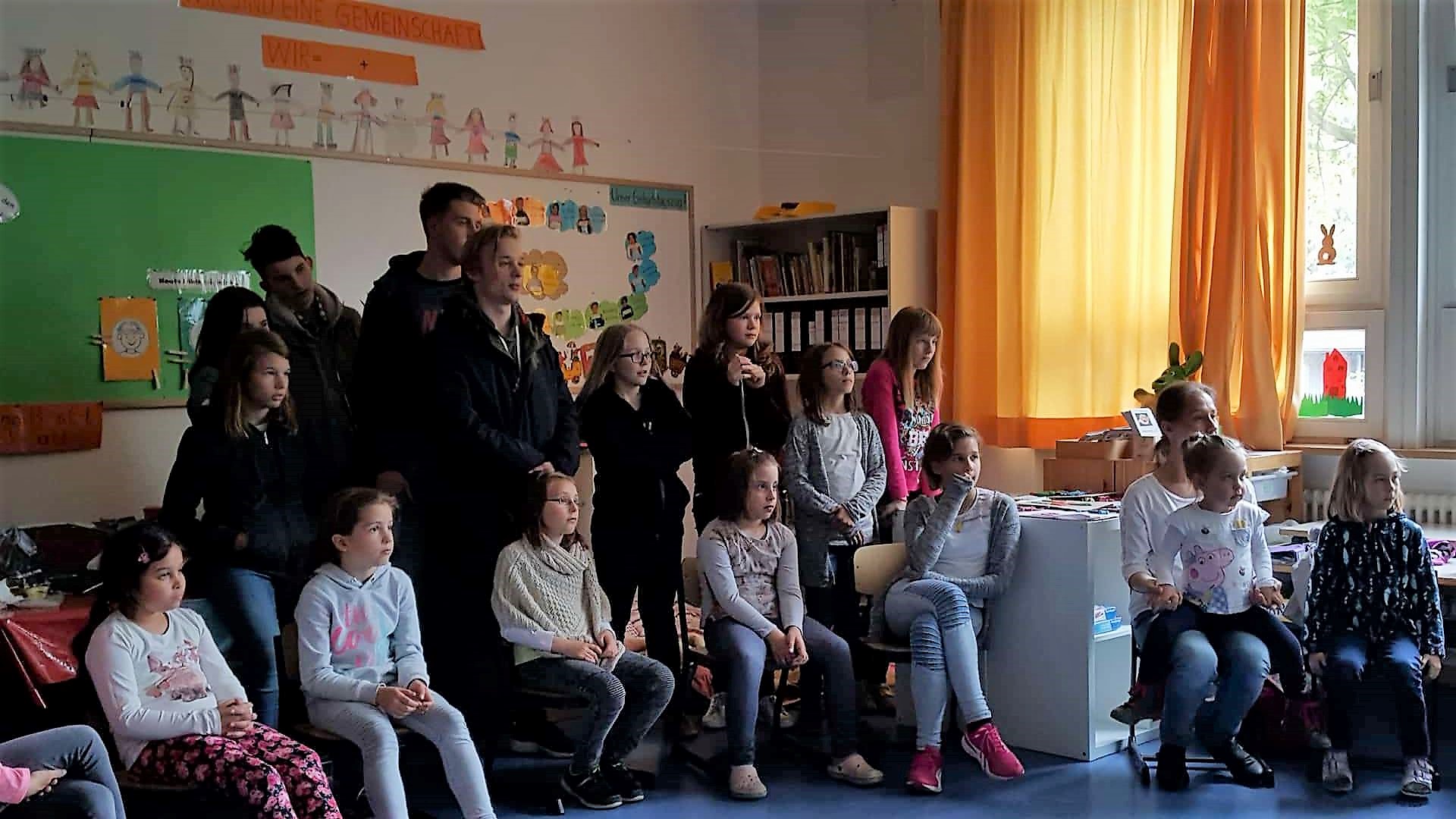 Próba után a regensburgi konzuli Magyar Iskolában tartottam maratoni népi hangszer-ismertetőmet 90 percben. A gyermekek nagyon érdeklődőek voltak, a tanárnőik pedig annyira beleélték magukat szerepeikbe, hogy igazán örömteli délutánban volt részünk, aminek csak az időkorlát szabhatott határt. Bevonultam a tamburával, majd miután beszéltünk róla, számba vettük az évszakok terméseit: gabonáit, gyümölcseit, a télre gyűjtögető állatokat, csak a medve lógott ki a sorból. Yousfi Ivett tanító nénit medvévé változtattuk, s megtanultuk dalocskáját: Bújj, bújj medve… Amíg citeráztam, Ocskai Marianna tanító néni ügyesen köcsögdudált, elindult a medvénk is, így Kapásné Papp Veronika tanító nénivel jól megtáncoltattuk a gyerekeket. Ezután pihenésképpen megnéztük a citerát, kipróbáltuk a köcsögdudát, meséltem a Szent György napi kihajtásról, hogy e napon történt az állatok első kihajtása téli szálláshelyeikről. A néphagyomány ugyanis az igazi tavasz kezdetét mindig is Szent György napjától, április 24-től számította. Sorra vettük a pásztornépet hierarchia szerint: a kisgyermek 5-6 éves kortól libapásztor, ezt követi a rangsorban a kanász, vagy kondás, a juhász, a gulyás, a rangsor élén a csikós áll. Kiosztottam egyszerű népi hangszereimet, a rece-ficét, Y-csörgőt, csattogót, cserépdobot… Majd együtt muzsikálva énekeltünk egy-egy dalt a pásztorokról. Megnéztük a csengőket, kolompot, kutyapergőt is egy-egy állathoz párosítva. Beszéltünk a terelőkutya-fajtákról is. Miután a nagyobb tanulók is csatlakoztak hozzánk, sorra átismételtük hangszereim neveit, bemutattam a dorombot és a kobozt. Majd előkerültek a pásztornépek hangszerei, a különböző furulyafélék: a tilinkó, sültü, kettősfurulya és a kaval. Még táncoltunk, játszottunk volna egy kis moldvai muzsikára, de az időnk sajnos letelt, így búcsút vettünk egymástól, s én indultam a József Attila-emlékestre, hogy hangszereimmel színesítsem a programot.
