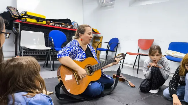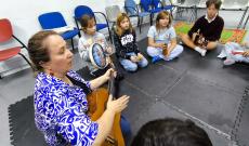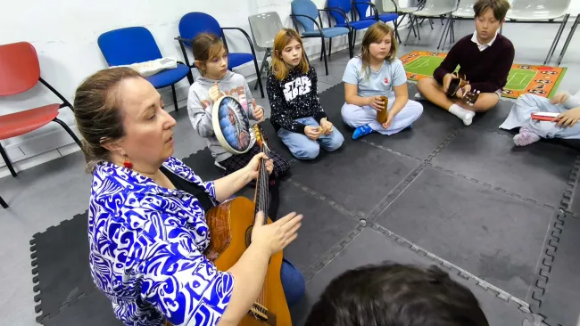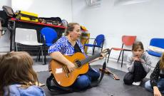 Olga a legkisebbeknek tartotta az első órát, amelyen az anyukákkal együtt vettek részt a gyerekek. A nagyobbak ezt követően hangszerbemutatóval egybekötött zenés foglalkozáson vehettek részt, és külön öröm volt nekem hallani, hogy az előző alkalmakon tanult népdalokat már biztonsággal, örömmel énekelték együtt Olgával.
