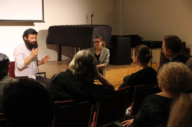 A vetítés előtt beszédet mondott Nagy Ildikó, a Magyar Ház igazgatója, aki elbúcsúztatta Vadász Zitát, hiszen ez volt az utolsó közös munkájuk. Majd köszöntötte a nézőket Kumin Ferenc, Magyarország New York-i főkonzulja is. A vetítést követően Röhrig Gézával, a film főszereplőjével beszélgetett Vadász Zita, a Balassi Intézet – Magyar Kulturális Központ igazgatója. Röhrig Géza elmondta: mielőtt elvállalta a szerepet, úgy volt vele, hogy van elég holokausztfilm, és a mának nem tett jót Hollywood. Megjegyezte azt is: az amerikaiaknak nincsenek transzgenerációs, nemzedékeken átívelő traumáik, ezért nem tudnak a holokausztról sem igazán jó filmet csinálni. Ráadásul az ortodox zsidók identitásának nincs a középpontjában a holokauszt, tette hozzá.