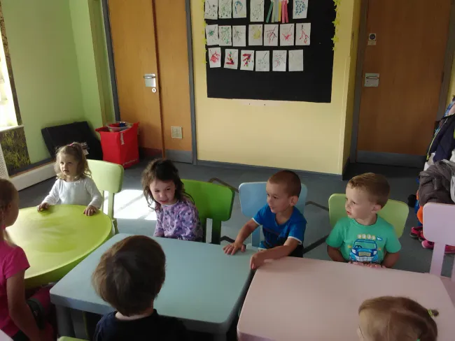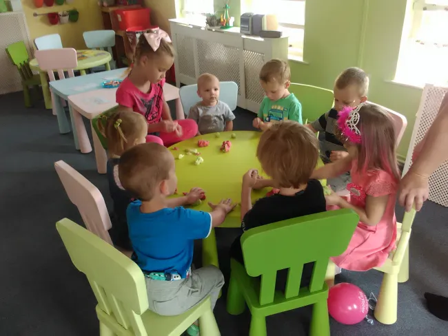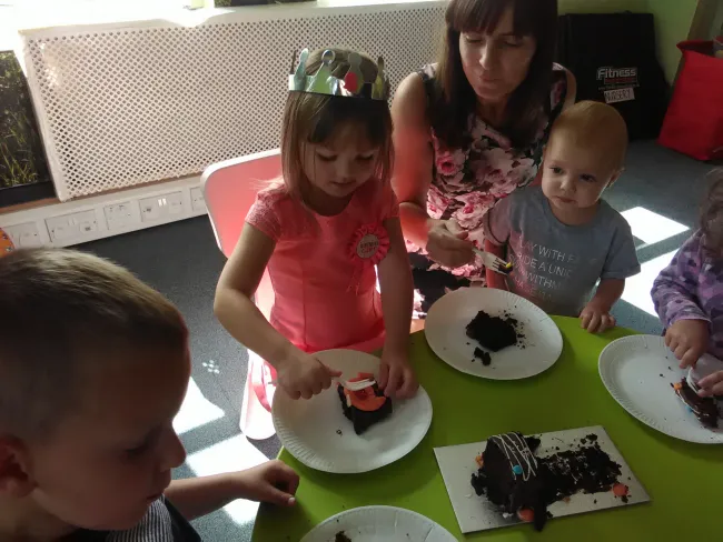 Szeptember 16-án szombaton is készültek valamire. Előkerültek a színes tányérok, a kis villák, a poharak, a "Happy Birthday" -es szalagok és minden gyerek feldobva szaladgált a teremben. Aztán megérkezett Kamilla, a szülinapos kislány, koronával a fejecskéjén, kistestvérével és anyukájával. Megilletődve fogadta a "magyaros" köszöntést, énekeltünk és körbetáncoltuk, majd elfújta a négy gyertyát. A csokitorta pillanatok alatt elfogyott és alig maradt időnk a tervezett foglalkozásra. De aztán a gyurmázás minden kezecskét jól átmozgatott és ismét összehozta a kis csapatot!