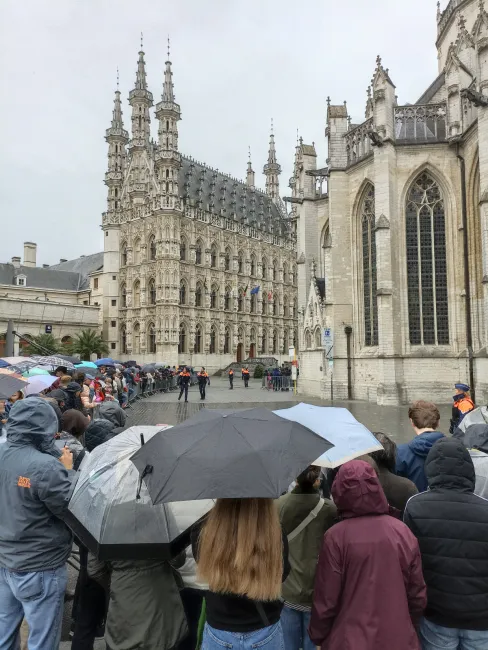 Szerencsére a rossz időjárásra fel voltunk készülve, volt nálunk meleg ruha és esőkabát. Több mint egy óra várokozás után, végül megjelent Ferenc pápa és áldásokat osztogatva átvonult a hangulatos leuveni utcákon. Korai kiérkezésünknek köszönhetően, néhány méter távolságra láthattuk a Szentatyát.