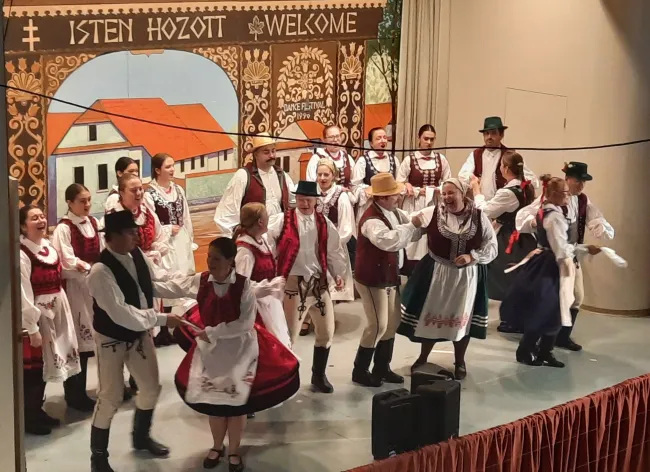 A szentmise után bőséges és ízletes ebéd, valamint a vancouveri magyar néptánccsoportok műsora várta a vendégeket. Elsőre is látszódott, hogy milyen sokan voltak jelen az ünnepségen, hiszen a nagyterem teljesen megtelt és a konyhában több mint 180 adag étel készült. Az ebédet a Csárdás Gyermek Néptánc Együttes fellépése követte. A gyerekek szilágysági táncot mutattak be. Utánuk a Forrás Felnőtt Néptánc Együttes táncosai léptek a színpadra. A felnőttek bemutatója erdélyi, egészen pontosan, nyárádmenti tánc volt. Mindkét produkciót hatalmas taps fogadta.