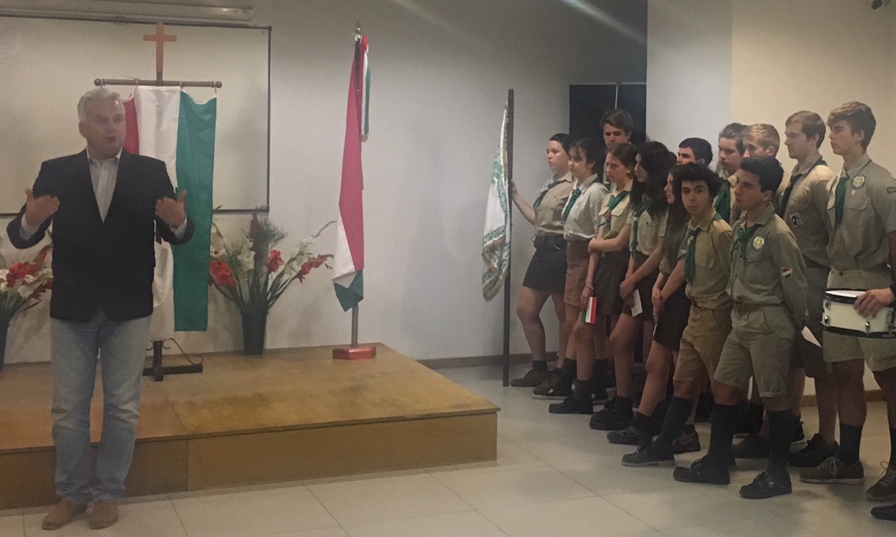 A zászlófelvonás és az argentin himnusz elhangzása után az 1956-os lukas zászló ünnepélyes bevonulása következett, majd dr. Semjén Zsolt miniszterelnök-helyettes úr megemlékező beszéde hangzott el. Köszöntő szavai után történelmi párhuzamokat vont 1956 és a korábbi nagy, nemzeti eseményeink között. Megemlítette, hogy Szent István feladata volt, hogy a kereszténységhez és a keresztény Európához csatlakoztassa országunkat. 1848-ban a Haza és a Haladás jelszavaival a függetlenség és a polgári átalakulás volt a szükséges történelmi tett. Ugyanígy 1956-ban a szuverenitásunk, a függetlenségünk visszaállítása, és az ország csatlakoztatása a világ demokratikus részéhez volt a nemzet akarata. Igaz, az idegen tankok leverték az 1956-os forradalmat, de ez volt az első döfés a diktatúra és idegen uralom szívébe. Megállapította, hogyha nem lett volna a magyar 1956-os forradalom, akkor Olaszország és Franciaország is „beleszédült volna a kommunizmusba”.