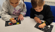 Rövid szünetet követően kezdetét vette a kézműves foglalkozás, ahol a gyerekek karcolásos technikával hangolódtak az őszre: színes állatok és tájak kerültek elő a fekete lapok alól. Ezután közös énektanulás következett – a „Pál, Kata, Péter jó reggelt!” című dalt zenés kísérettel tanulták meg a gyerekek.