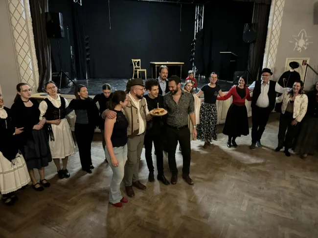 A koncert különlegessége abban is rejlett, hogy egyszerre ünnepelték a helyi magyarok a Regös Néptáncegyüttes 45 éves és a Regös Magyar Néptánc Egyesület 10 éves születésnapját! Amikor ezekre a számokra gondolunk, érdemes elfantáziálni azon, hogy mi az, amit mi magunk ennyi éven át kitartóan, szünetek csinálunk. Amint elkezd összeállni bennünk a lista, és visszaemlékszünk, hogy mennyi kitartás, hullámvölgy, élmény és támogatás, határozottság kellett ahhoz, hogy ez így történjen, könnyen elönthet bennünket az elismerés érzése. Szülinaposokból tehát nem volt hiány, főképpen azért is, mert az együttes vezetőjét, Bilicki Viktort is köszöntötte a közösség.