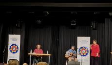 A délelőtti előadáson nemcsak az iskola tanulói és szüleik vehettek részt, hanem nyitott volt külsős vendégek számára is. A megnyitó után felváltva hallottunk megzenésített darabokat és felolvasott verseket, sőt Dániel a közeljövőben megjelenő művéből is előadott egy kis ízelítőt. A legkisebb hallgatóságot is bevonva közösen énekelték a dalokat Molnár Györggyel, bár a közönséget elnézve, a felnőttek olykor lelkesebben énekeltek.