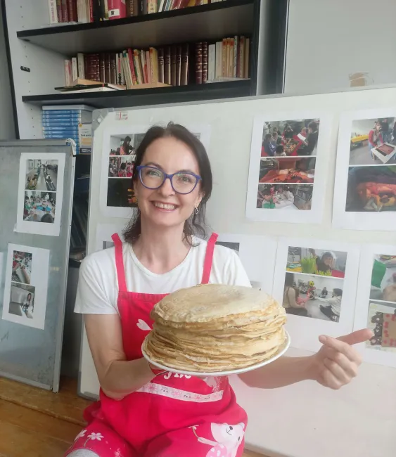 Az idei tanévet ciklikusan szerettem volna lezárni – ezért ugyanabban a rózsaszín kötényben érkeztem az utolsó magyarórára, mint az év legelső alkalmán. Egy szülő meg is jegyezte, hogy ez a vidám szín mennyire üdítő változás a megszokotthoz képest. A kötény amúgy is különleges számomra – évekkel ezelőtt szülinapi ajándékként kaptam, a felirata pedig tökéletesen illett a mai, palacsintás évzáróhoz.