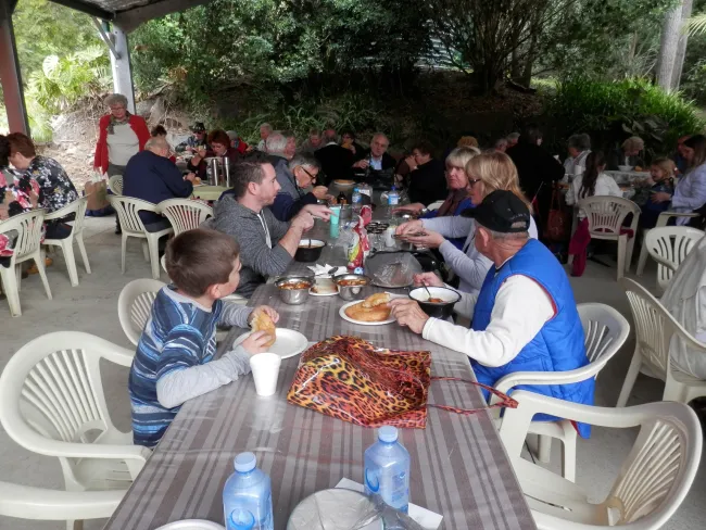 Mire véget ért a megemlékezés, már mindenki kellőképp megéhezett ahhoz, hogy jóízűen elfogyaszthassa az ebédül szolgáló gulyást és lángost. A kerti helyiség megtelt élettel, mintegy 80 magyar zarándok érkezett az alkalomra, vidámságuk bezengte az egész völgyet. A jó hangulat egészen délután 4-ig kitartott, ekkor kezdtek csak hazaszállingózni az emberek.