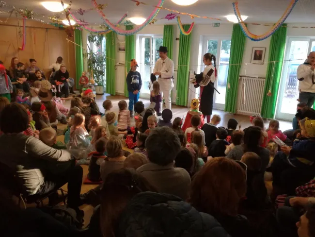 Ezután vette kezdetét a táncos mulatság a táncházban, amely során dunántúli, dél-alföldi és moldvai játékokkal, táncokkal ismerkedhettek meg a résztvevők Zoltán (koboz) és a müncheni népzenészek, néptáncosok Lui Henrichs, (hegedű) Sági Dóri (ének, tánc), Diószegi Bálint (tekerőlant) közreműködésével. A farsangolás nem maradhat el alakoskodás nélkül. Zoltán bemutatta a Csattogószájú „Turka" nevű kecskéjét, s elmondható, hogy igen nagy népszerűségnek örvendett a termetes jószág. A táncház mellett kézműves foglalkozással is színesítették a szervezők a programkínálatot, amelynek jómagam is előkészítője, foglalkozás vezetője voltam. Török Éva, a Regös Egyesület elnökségi tagja és az én segítségemmel az aprócska kezekben csattogott az olló, egyedi mintákat rajzoltak a filcek, színes papírok keltek életre. Fánkkal, kürtös kaláccsal, lángossal, a magyar ízek – Leckerwerk - büfékocsija parkolt a Misszió udvarán, hogy teljes legyen a kínálat a délutáni családi mulatság során. Mindenki megtalálta a kedvére való kikapcsolódás lehetőségét.