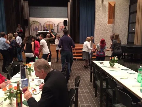 Estefelé megérkeztek az első vendégek a Bruder Klaus plébánia feldíszített nagytermébe. A zene megszólalt a teremben, eközben a konyhán az olajat felforrósították, és kezdték sütni az első szelet húsokat. Az idei vacsora-menü: sertéspecsenye volt paprikás-hagymás burgonyával és uborkasalátával. Mint eddig minden évben, most is lehetett magyar finomságokat kapni a süteményes asztalnál. A finomságok igazán népszerűek voltak. A hatalmas tál tepertős pogácsa tíz perc alatt elkelt, de a házi zserbóból és a házi mákos-almás rétesből sem maradt az est végére. Ezúton is köszönjük a sok finom süteményt, amit a rendezvény céljára sütöttek! A tombola idén is izgalmas és változatos volt; többek között értékes vázákat, órákat és finomságokat lehetett nyerni. A főnyereményt, a bőségkosarat is megnyerték. Az est folyamán a terem megtelt, folyt a vidám beszélgetés. A jóízű vacsora mellett igazi magyar tánc- és szórakoztató zenére ropták a majálisozók. Igazi majálisi hangulatban telt az est.