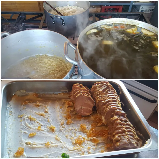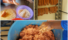Miközben igyekszünk mielőbbi megoldást találni a további betörések megelőzésére, készültünk a disznótoros ebédre is, melyre a szokásnak megfelelően a desszertet én készítettem. Bár tudom, hogy a Rákóczi-túrósnak semmi köze nincs a fejedelemhez, az ötlet mégis az emlékév okán ötlött fel bennem és úgy döntöttem, hogy idén ez lesz az első olyan tradicionális magyar sütemény, melyet elkészítek az itt élőknek. Már a szombati napon reggel kint voltam a Tanyán és mialatt szakácsunk, Dóka Laci a kolbászt és hurkát készítette, összedobtam a süteményt kb. 80 főre. Nem volt egyszerű dolog, hisz csak 3 sütő van a Tanyán, melyekre értelemszerűen mindkettőnknek szükségünk lett volna, de szerencsére Lacival tudjuk már kezelni egymás „rigolyáit”, így viszonylag zökkenőmentesen elkészült minden sütést igénylő étel délután 5 óra körülre.