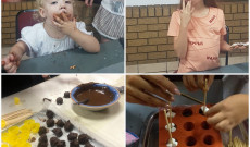 Már a pénteki egész napot előkészületekkel töltöttem, hisz a kurzust magyar óra és ebéd is megelőzte, így gondoltam, hogy arra semmiképp sem lesz időnk, hogy órákat várjunk, míg a ganache megszilárdul. Így előre elkészítettem egy adagot, amiből a résztvevők kis golyókat formáztak, majd azt temperált csokiba mártottuk, vagy épp kakaóporban hempergettük meg. Hasonlóan készült a zserbógolyó is, a kekszből, dióból és sárgabaracklekvárból gyúrt masszából gömbölyített labdácskák is csokiba merültek, hogy a zserbó ízvilágát idézzék fel, sütés nélkül. Nagy sikere volt még a szaloncukornak is, melyhez a feketeribizlit felfőztem némi likőrrel, majd aprítva a marcipánmasszába kevertem. Ebből formáztunk szaloncukrokat, melyhez sikerült aranyszínű fényes papírt is találnom, így a csomagolásuk is a tradicionálisat idézte. A mézeskalácsokat reggel sütöttem meg, a formák kiszaggatásában Borka és Ryan nagy segítséget jelentett, elég jókat nevetgéltünk a konyhában a gyerek magyar óra után, melyen a magyar népmesék volt a téma.