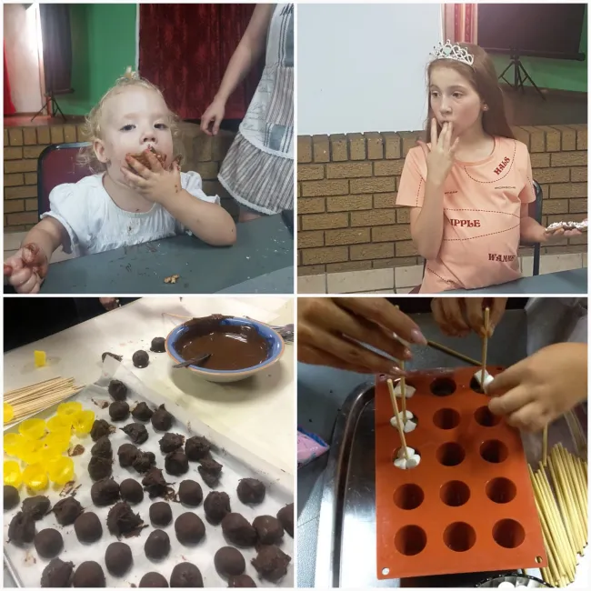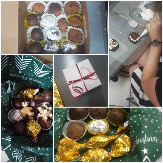 Mivel ezt egy elég kedves gesztusnak tartották, gondoltam, hogy együtt is megpróbálhatnánk az ehető ajándékok elkészítését. Én a csokoládé-készítést a Szamos égisze alatt tanultam,így a trüffel receptek onnan származtak. A bonbonokon kívül készítettünk még mézeskalács díszeket, zserbógolyót, ribizlis marcipán szaloncukrot, marcipánlikőrt, forrócsoki-pálcát és egy narancsos marcipánkrémet is megkóstolhattak a résztvevők.
