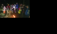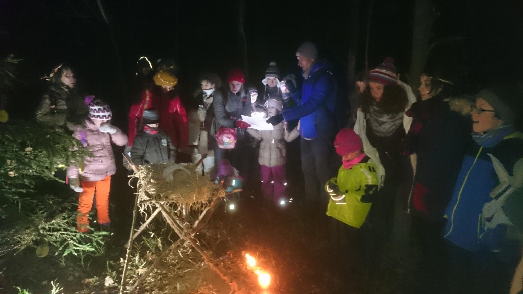 Lassan megérkeztünk az előre gondosan kiválasztott helyszínre. Itt Gyimesi Zoltán cserkészparancsnok-helyettes értő irányítása mellett a fiúk jászolt építettek, mialatt a kislányok a 14 éves Beátával egy kisebb fenyőfát díszítettek fel madáreledellel. Míg folytak az előkészületek, én furulyáztam a megbeszélt karácsony énekeket az anyukákból, apukákból összeállt alkalmi kórusunknak. Később letelepedtem a feldíszített fa mellett lévő tuskóra, és citerámat pengetve teremtettem ünnepi hangulatot a munkához. Mire teljesen besötétedett, már csak az üvegekbe gondosan elhelyezett mécsesek, gyertyák világítottak. Megkezdődött alkalmi eladásunk. Míg kórusunk citerakíséretemre énekelt, a szereplők eljátszották a cselekményt. Mária szállást kért a bő kovácstól, aki ezt megtagadta tőle. Vak leánya azonban elvezette őt az istállóba a jászolhoz. Itt az angyalok segítségével megszületett a kis Jézus. Majd József Máriával visszament a bő kovácshoz szemrehányást tenni, amiért nem adott szállást Máriának. Ezután sorra énekeltük a karácsonyi énekeket, az erdő friss levegője szentelte meg ünnepünket. Kiosztották az ajándékokat: cserkész naptárakat, szaloncukrokat. Előkerültek a sütemények is a gyermekek nagy örömére. Szerencsére meleg innivalóban sem volt hiány. Ha kissé átfázva is, de jólesett hazafelé a séta, s a közel negyven fős csapat maga után rendet hagyva, nagy élménnyel gazdagodva hagyta el az erdőt.