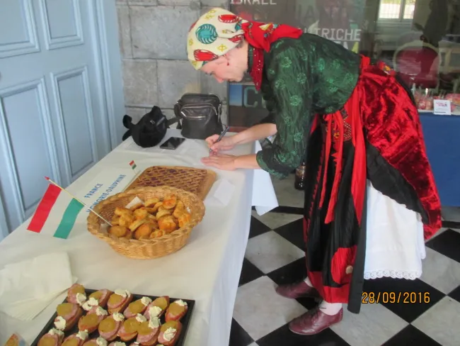 Ösztöndíjasságom alatt rendszeresen járok Lyonból Grenoble-ba, hiszen az ottani magyar közösség vezetője, Reményi György a mentor helyettesem. Ez alkalommal egy nemzetközi rendezvényen képviseltük a magyar nyelvet. Hogy még jobban rá lehessen érezni szép nyelvünk ízére, krumplis pogácsával és rácsos diós süteménnyel érkeztünk. Kisebb feltűnést keltettem kalotaszegi viseletemben, hiszen én voltam az egyetlen, aki hagyományos öltözékben jelent meg, ami később jó beszédtémának bizonyult a többi nemzet képviselőjével.