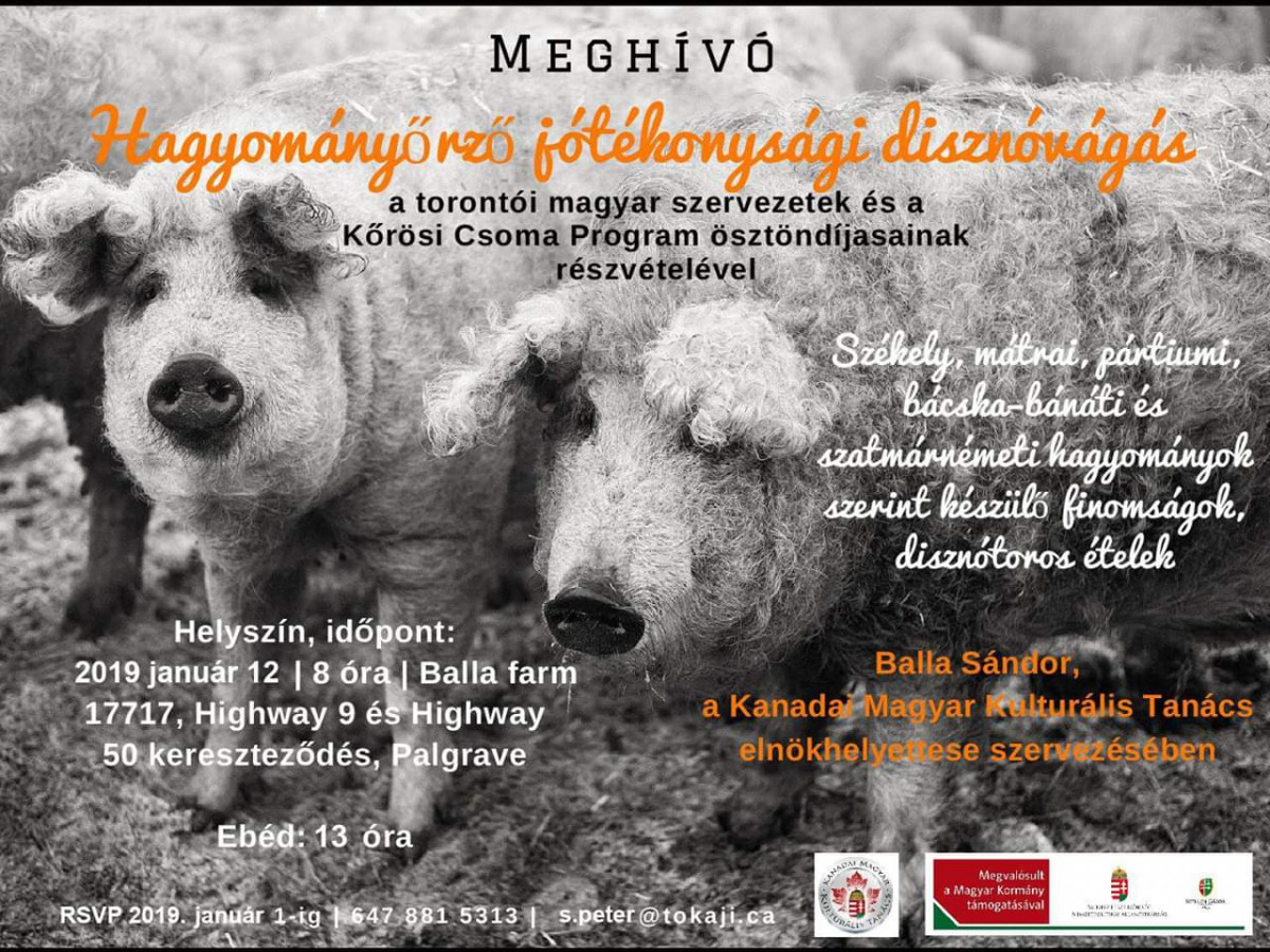 A torontói magyar szokásokhoz híven idén is jótékonysági hagyományőrző disznóvágással indította az évet a Torontón és környékén élő magyar diaszpóra. Az eseménynek január 12-én Balla Sándor, a Kanadai Magyar Kulturális Tanács elnökhelyettesének farmja adott helyett. A meghívottak között szerepelt Palkovits Valér főkonzul mellett a torontói Magyar Főkonzulátus összes tagja. Tiszteletüket tették a helyi és környékbeli magyar szervezetek vezetői is, akik csapatokba szerveződve saját hagyományaik és tradícióik szerint készítették el a feldolgozott malacokból készült ételeiket. A Bácska-Bánáti Kör, az Orbán Balázs Társaság, vagy akár a Torontói Vadász és Horgász Egyesület is saját ízlésvilága szerint fűszerezte a hurkákat, kolbászokat.