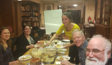 Az őszi, tízhetes magyar nyelvtanfolyam utolsó órája Hálaadás hetére esett, így a kezdő csoport tagjaival magyar ételekkel ünnepeltünk. Köszönet Guy-nek a csirkepörköltért nokedlivel és ubisalival, Davidnek a dobostortáért, Gwennek a pogácsáért, Christának a palacsintáért, Parisának a borért!