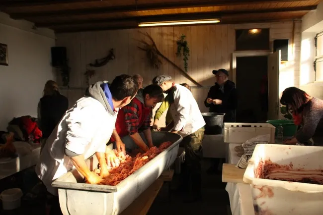 A legkorábban érkezőket már várja az éppen elkészült toros káposzta, melyet vidám emberek főztek és porcióznak nekik (jókedvük különösen értékelendő, hiszen hajnalban a disznó még élt). Hamarosan a helyi idősek megtöltik a kolbászokat, a fiatalokat tanítják a mikéntekre, elkezdődik a sütés, és mikor mindenki kellőleg megéhezett, pompás lakoma várja őket.