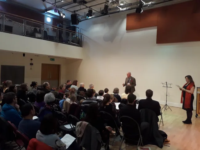 A másfél órás koncertet egy rövid szünet szakította meg, ahol a résztvevőknek lehetőségük nyílt megismerkedni, beszélgetni egymással. A szünet után további magyar népdalokat és komolyzenei előadásokat hallhattunk a Cardiffi magyar gyerekek és a Kodály Violin School előadásában. Janet McDonald és Sillo Elizabeth magyar és walesi nyelven előadott duóját, valamint Hope Vaughan-Huges fuvolajátékát is meghallgattuk a második félidőben. A koncert zárásaként a magyar music club vezénylésével a Nád a házam teteje című dalt tanítottuk meg a walesi-magyar közönségnek. A nyelvi akadályok leküzdése céljából mutogatással kísértük a dal tanítását, ami igazi jó kedvre derített mindenkit.