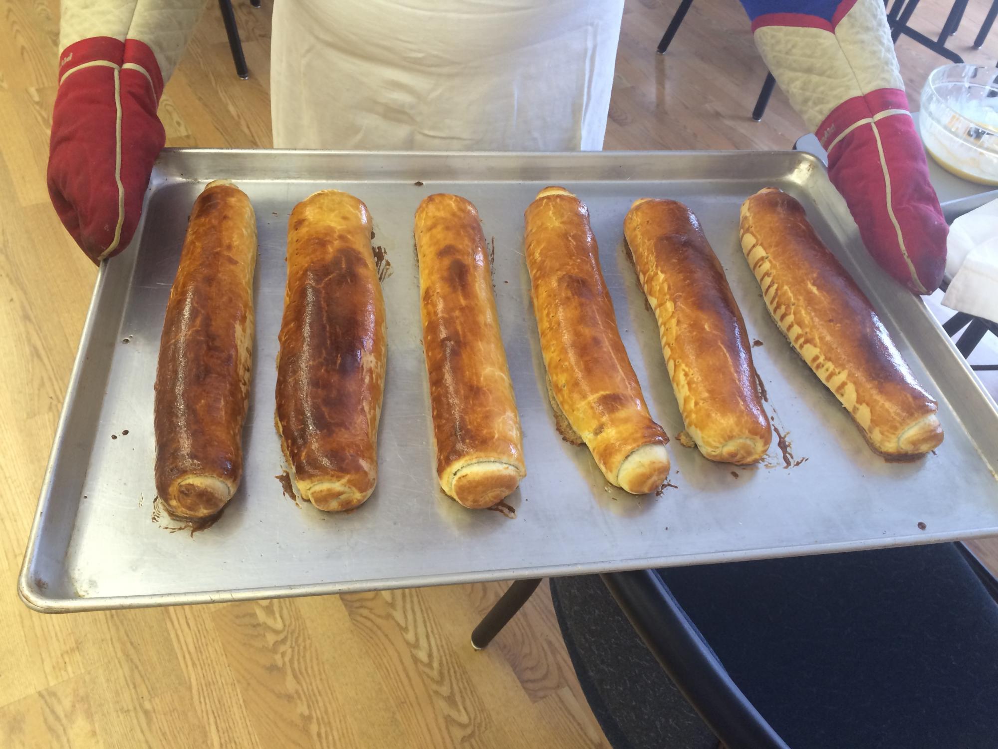 A finom hurka és kolbász mellé az egyesület hölgy tagjai süteményeket és töltött káposztát készítettek. Ez egy teljes héti munkát jelentett, aminek idén én is résztvevője lehettem. Az első napokban mákos és diós beiglit sütöttünk, majd a töltött káposztához a töltelékek elkészítésével foglalkoztunk. Ezekből a finomságokból készültek a legnagyobb adagok. De sütöttünk zserbót, diós és mákos kiflit, illetve batyut, kókuszos linzert, hókiflit, almás rétest, fonott kalácsot és habcsókot is. Minden nap jó hangulatban kezdtük a munkát, délben együtt ebédeltünk és jóízű beszélgetésekkel fűszereztük a pihenéseket. Az önkéntes dolgozók száma napról napra változott, volt, hogy 15-en sürögtünk-forogtunk a konyhában, de volt, hogy csak heten, vagy nyolcan. A jó hangulatot a mindannyiunk számára jól ismert magyar nóták biztosították. Tésztanyújtás közben vídáman énekeltünk együtt.